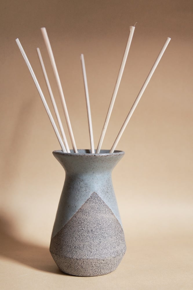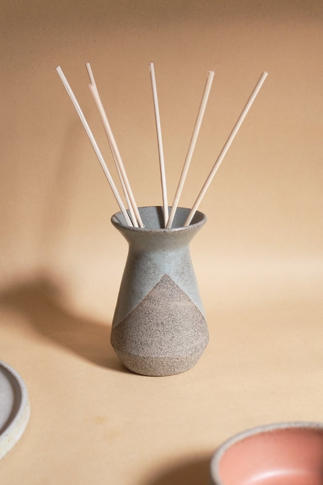 The vessel is hand thrown with a narrow neck to hold the sticks upright, they are around 9.5cm tall and glazed in bespoke glazes, this one is for Kirikiri.