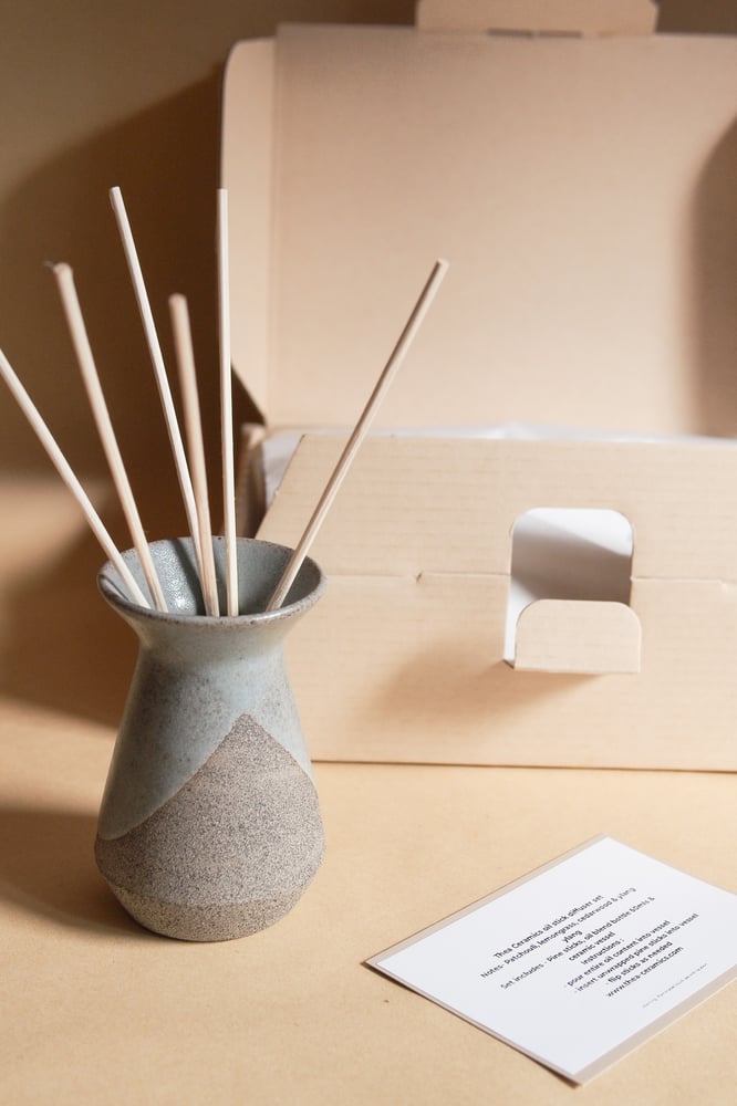 The set comes with 50mls of essential oil blend, 6 x pine sticks, instructions and a hand thrown mini vessel in 6 different tones, all boxed in a bamboo paper gift box.