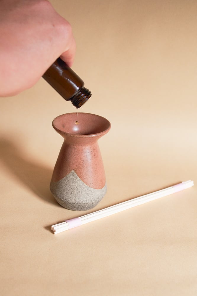 The set comes with 50mls of essential oil blend, 6 x pine sticks, instructions and a hand thrown mini vessel in 6 different tones, all boxed in a bamboo paper gift box.